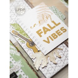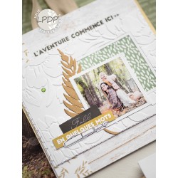 En accompagnement : la quincaillerie pour la structure (coins (la forme peut varier) oeillets, chaînette et connecteur), un tag géant collection Equinoxe, une trentaine de die cuts collection Equinoxe, 1 trombone en carton Artemio, 60 cm de ruban suédine couleur chamois, 2 m de ficelle de coton blanche, 6 dots adhésifs verts.
